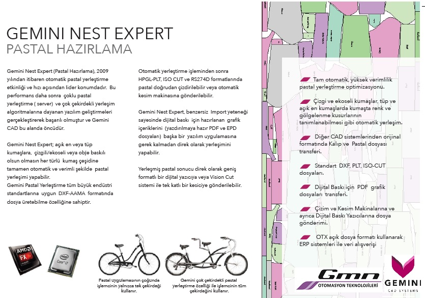Gemini Pastal Yerleştirme tüm büyük endüstri standartlarına uygun DXF-AAMA formatında dosya üretebilme özelliğine sahiptir.